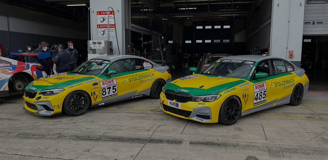Zwei Gelb-Grün lackierte BMW Rennwagen, getragen von Stolzenbach Baustoffe Sponsoring, stehen in einer Werkstattarena. Sichtbare Logos von Sonic Equipment, Falken-Reifen und BMW Cloppenburg kennzeichnen die Fahrzeuge, während Teammitglieder und Werkstattbereich im Hintergrund zu erkennen sind. Die Szene vermittelt ein Motorsport-Setting mit Fokus auf Rennsport-Partnerschaften.